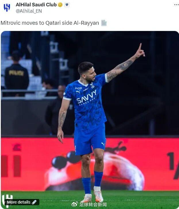 官方:利雅得新月宣布米特洛维奇将在解除合同后离队加盟卡塔尔赖扬队。